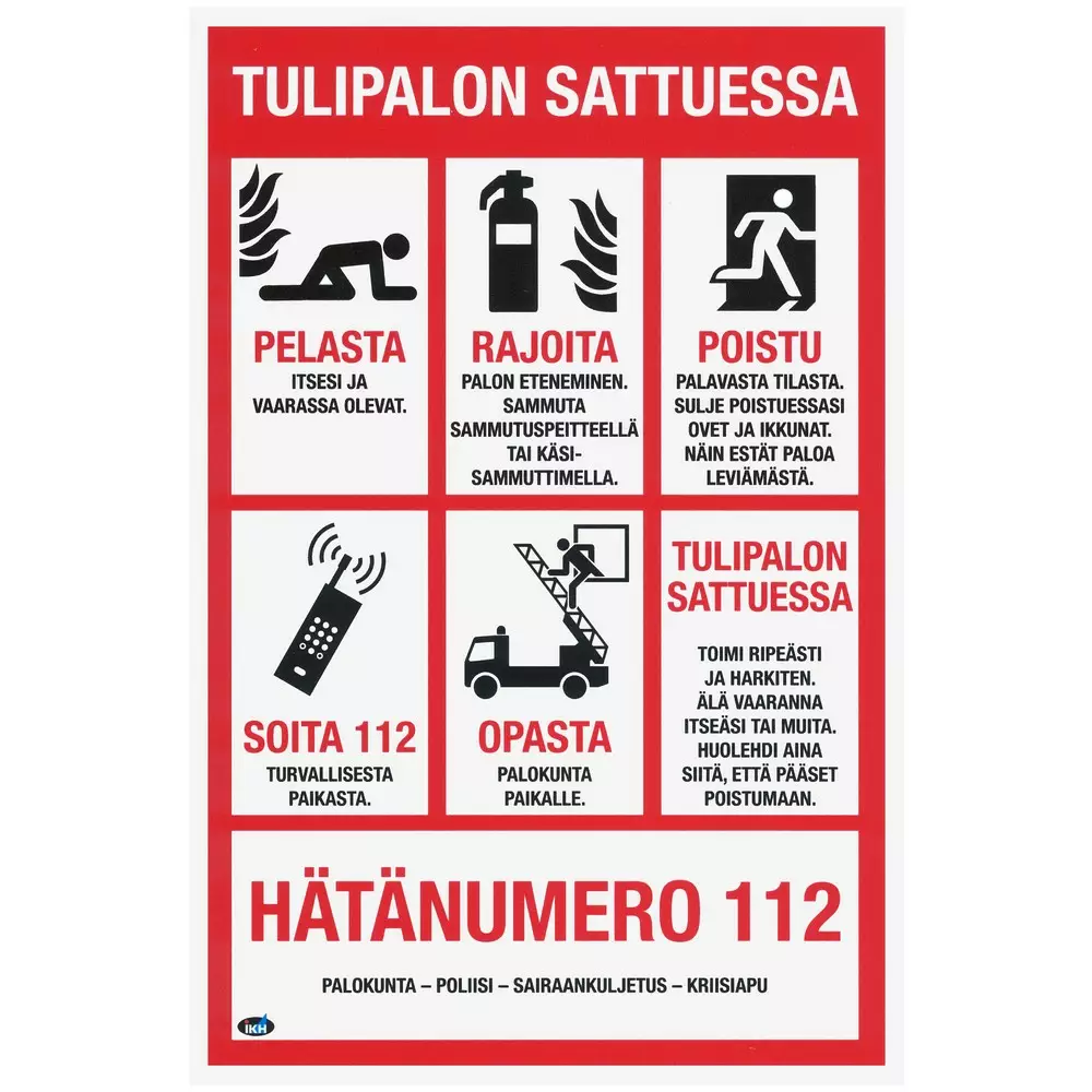 Kyltti tukee turvallisuutta työpaikoilla ja julkisissa tiloissa tarjoamalla yksiselitteiset toimintaohjeet tulipalon varalle. Se soveltuu pysyvään esillepanoon tiloihin, joissa turvallisuusohjeiden tulee olla helposti havaittavissa.