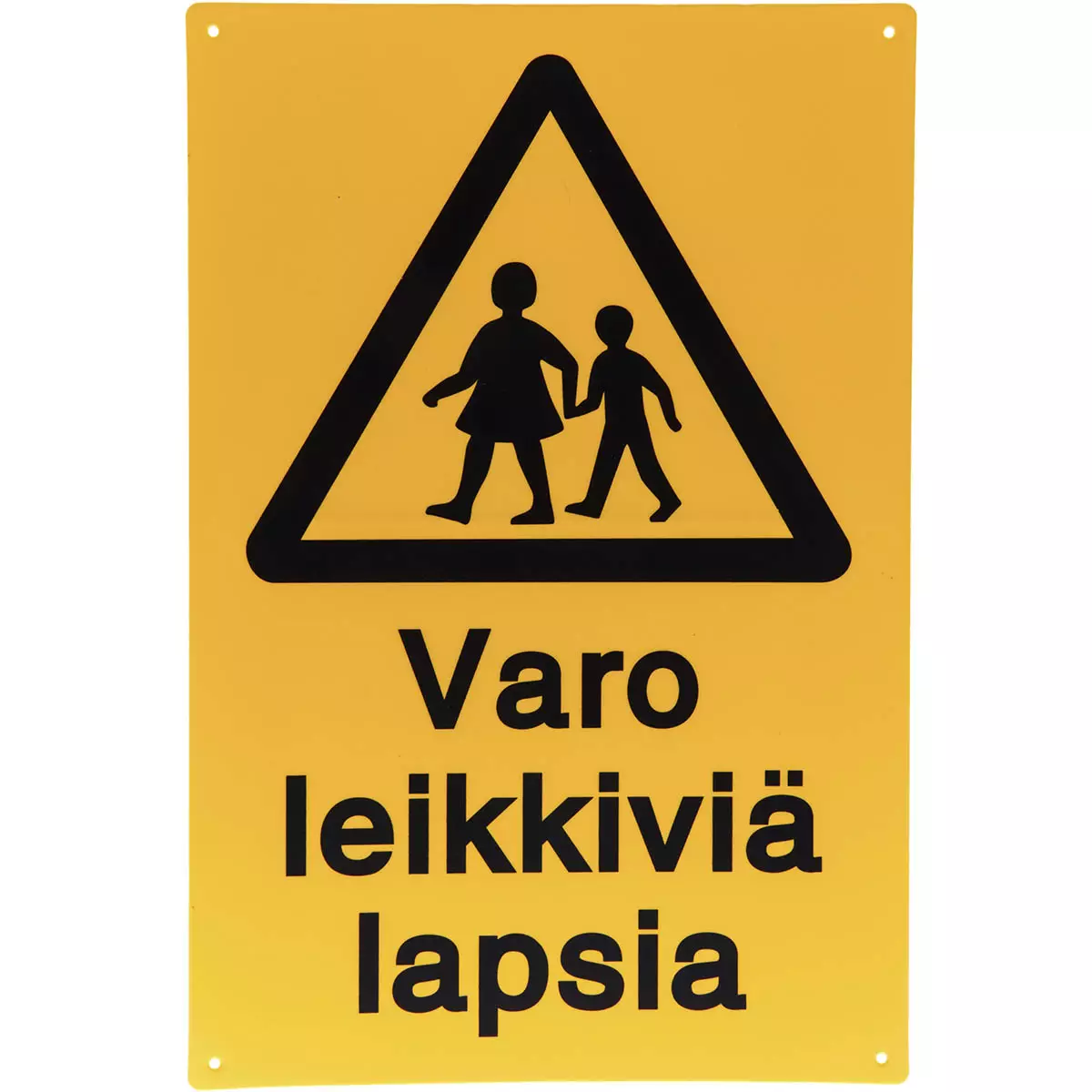 Varo leikkiviä lapsia -kyltti on edullinen ja helppo tapa varoittaa asutusalueiden ja vilkkaiden kulkuväylien varrella kulkevista lapsista ja nuorista. Muovinen opastekyltti kestää hyvin erilaisia sääolosuhteita, ja se on helppo kiinnittää esimerkiksi ruuvien tai naulojen avulla tolppaan, puuhun tai seinään kuitenkin niin, että siihen on hyvä näköyhteys.