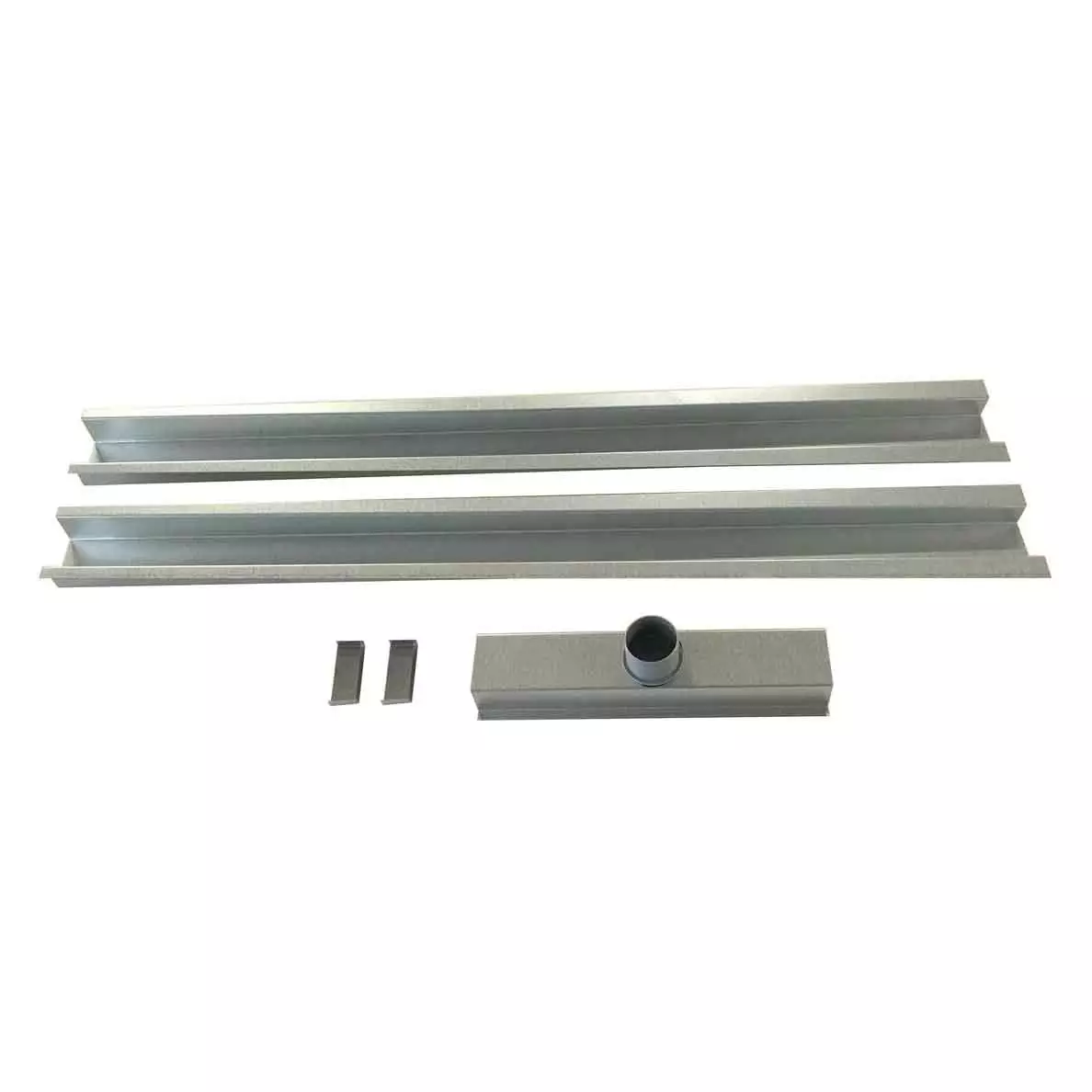 Asennus on helppoa. 2 sopivaksi lyhennettyä lattiakourua asennetaan tukipuiden varaan ja väliin asennetaan liitoskappale, josta vesi johdetaan 75mm viemäriputkeen. Kourujen säätövara on välillä 1600 - 3400mm