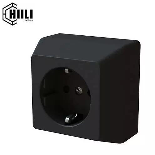 Harjun Hiili-sarjaan kuuluu tyylikkäitä mattamustia sähkökalusteita. Maadoitettu 1-osainen pistorasia kuiviin tiloihin.