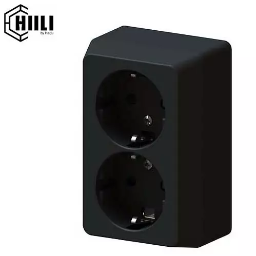 Harjun Hiili-sarjaan kuuluu tyylikkäitä mattamustia sähkökalusteita. Maadoitettu 1-osainen pistorasia kuiviin tiloihin.