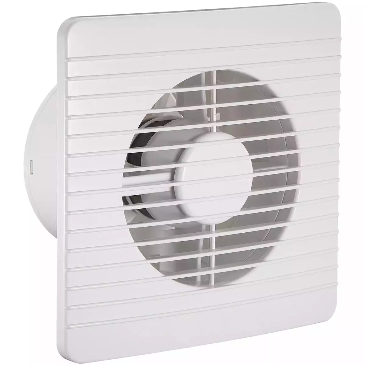 Ajastimella varustettu 120 mm poistoilmapuhallin kosteisiin tiloihin. IPX4-suojaus, 102 m³/h ilmavirtaus ja UV-kestävä ABS-runko.