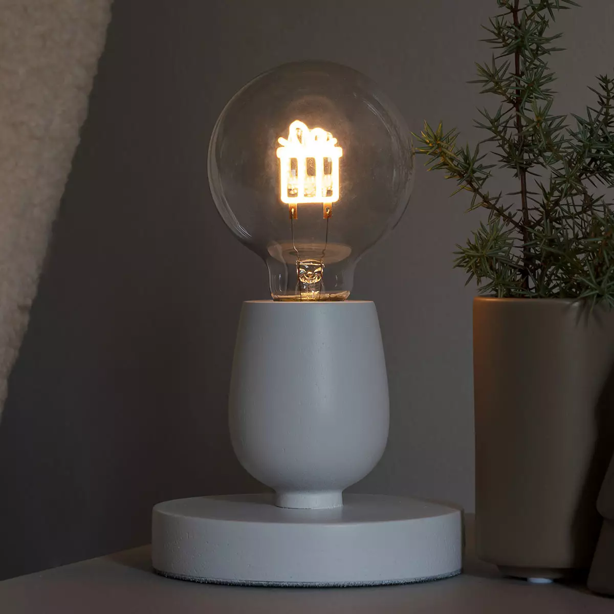 Tunnelmallisen hehkuva valokoriste on ihastuttava talven ajan sisustusesine, joka luo kaunista tunnelmavalaistusta kodin talvi- ja joulusisustukseen. Tunnelmallisesti valaiseva, puusta valmistettu pöytävalaisin on viimeistelty isokokoisella hehkulampulla, jonka sisällä on kaunis lahjan muotoinen led-valo.