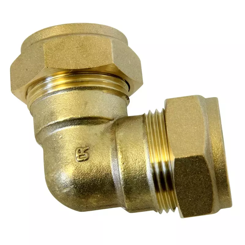 Erikoismessingistä valmistettu kulmamallin puserrusliitin, sisähalkaisija 15mm.