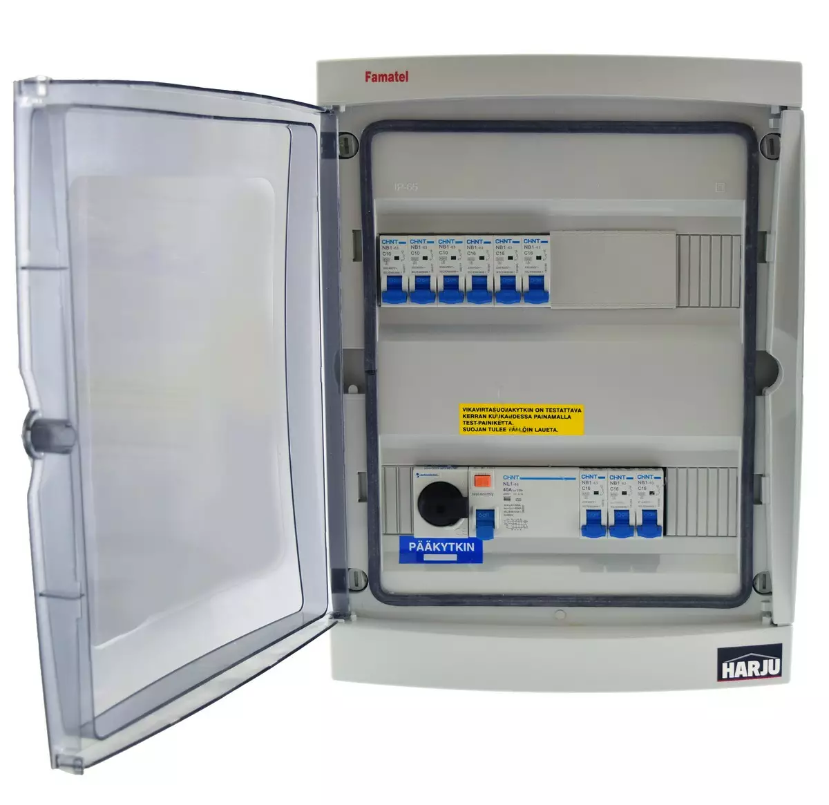 - Vikavirtasuojakytkin 4-napainen 40A/30 mA, jonka takana 3 kpl johdonsuojakatkaisijoita C16 A