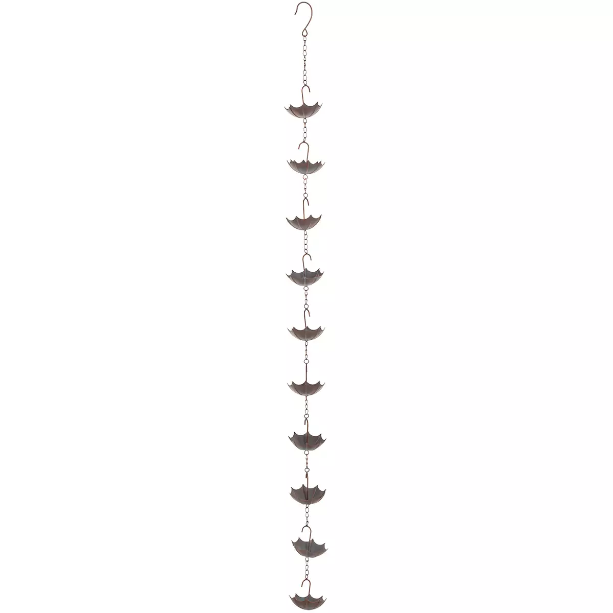 Sadeketjun pienet antiikin kuparinsävyiset sateenvarjot täyttyvät vedellä ja ohjaavat sen hallitusti alaspäin. Takorautainen rakenne takaa kestävyyden kaikissa sääolosuhteissa. 148 cm pitkä ketju on helppo asentaa ja sopii monenlaisiin käyttötarkoituksiin.