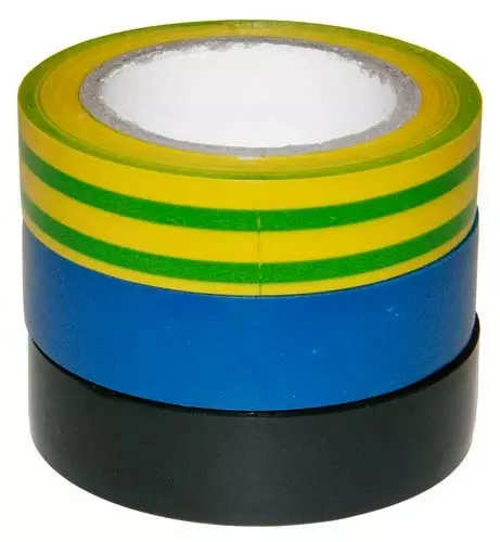 Pakkauksessa kolme sähköteippirullaa, teipien värit ovat musta, sininen ja kelta-vihreä.
