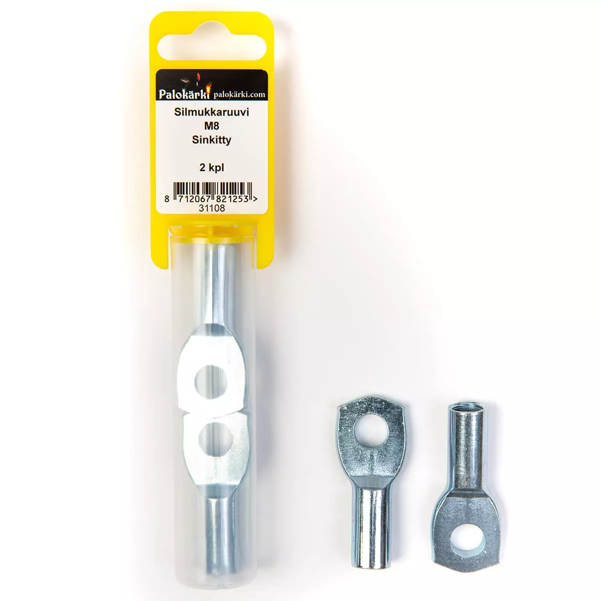 Sinkitty silmukkaruuvi M8. Silmukkaruuvia käytetään erilaisten kappaleiden välikiinnittämiseen toisiinsa. Silmukassa on M-kierteinen sisäkierre ja toisessa päässä reikä 8 mm kiinnitystä varten. Paketissa on 2 kpl sinkittyjä silmukkaruuveja.