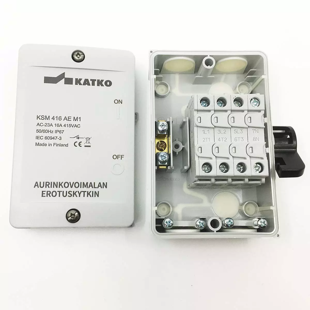 Turvakytkin vipu Katko KSM 416AE M1 on aurinkovoimalan erotuskytkin, joka on sivusta väännettävä. 4-napaisessa kytkimessä on integroituna kumiset läpiviennit. Materiaaliltaan turvakytkin on itsesammuvaa ja UV-säteilyn kestävää polykarbonaattia. Aurinkovoimalan erotuskytkimessä on suoja useita kemikaaleja vastaan. Turvakytkin on suojausluokaltaan IP67 ja sen maksimi nimellinen käyttöjännite on 400V. Mitoiltaan turvakytkin on 83mm x 55,6mm x 128 mm. Sivussa olevan vivun avulla eroituskytkin on lukittavissa, eikä kotelo vahingossa aukea.