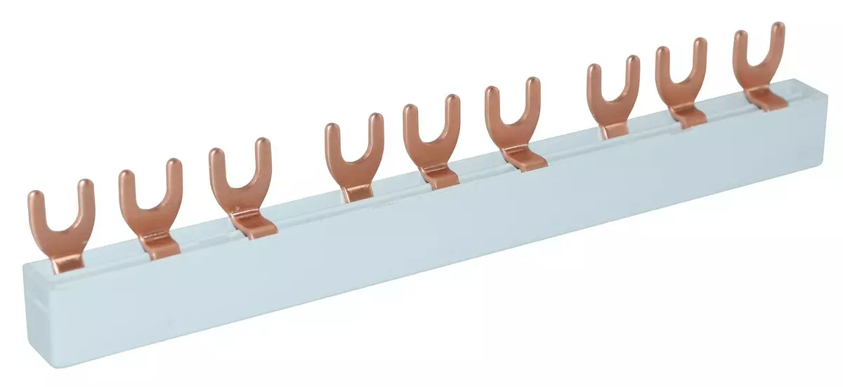 VIRTAKISKO 9 MODUULI 3P 10mm2 HAARUKKA Kolmivaiheinen haarukkavirtakisko. 10mm2 Haarukkamalli Pituus 9 moduulikojetta 9 moduulia 3 -vaihe