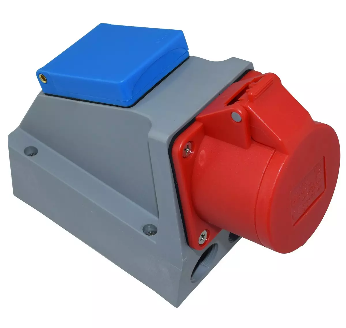 Viisinapainen 16A pistorasia sekä maadoitettu yksivaiheinen 16A pistorasia.