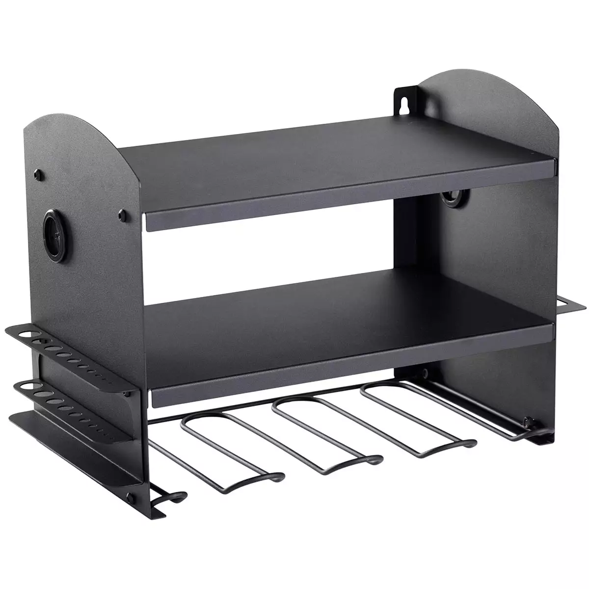 Musta työkaluhylly Organizer on valmistettu kestävästä metallista. Työkaluhylly on viimeistelty tyylikkäällä, mattamustalla värityksellä. Työpisteen järjestystä ja siisteyttä ylläpitävä työkaluteline sopii monenlaisiin käyttökohteisiin, kuten verstaille, autotallin työpisteille, korjaamoille, rakennustyömaille, remonttipisteille sekä kodin ja mökin pajoille. Monikäyttöinen seinälle kiinnitettävä työkaluhylly on erinomainen teline esimerkiksi poran tai ruuvinvääntimen säilytykseen ja akkujen lataukseen.