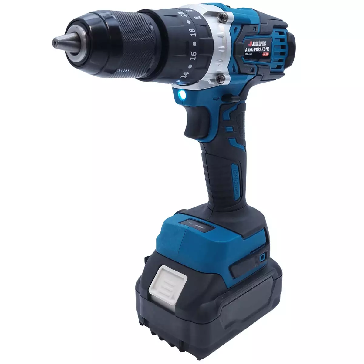 Jonköping DC-105 akkuporakone on suorituskyvyltään loistava vaihtoehto kotitalouksiin. Akkuporakoneessa on omat tilansa poraukselle, iskuporaukselle tai ruuvaukselle sekä valittavana on kaksi eri nopeutta käyttökohteen mukaisesti 0-400 tai 0-15000 kierrosta minuutissa. Työskentelyä helpottaa vielä rungossa oleva led kohdevalo, joka valaisee työstettävän kohteen. Ergonomisen iskuporakoneen kumipinnoitteinen kahva tarjoaa tukevan ja pitävän otteen.