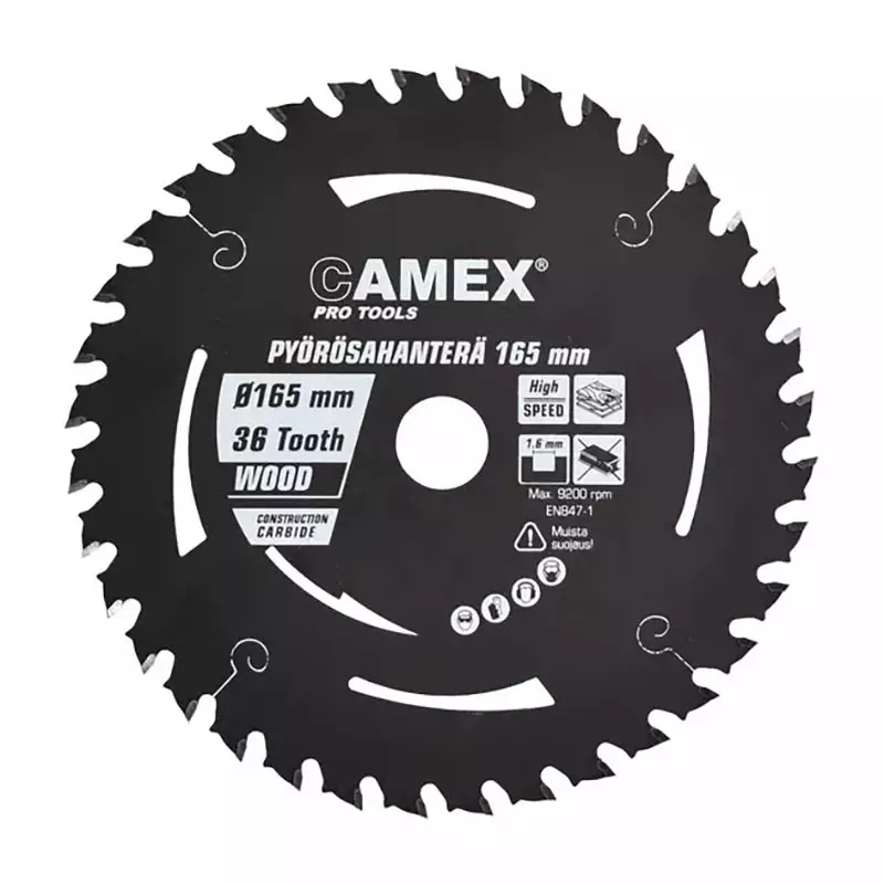Camex pyörösahanterä Pro 165 mm, 36T. 1,6 mm leikkuulinja ja kovametallihampaat tarjoavat siistin, tarkan ja tehokkaan sahauksen akkupyörösahoille.