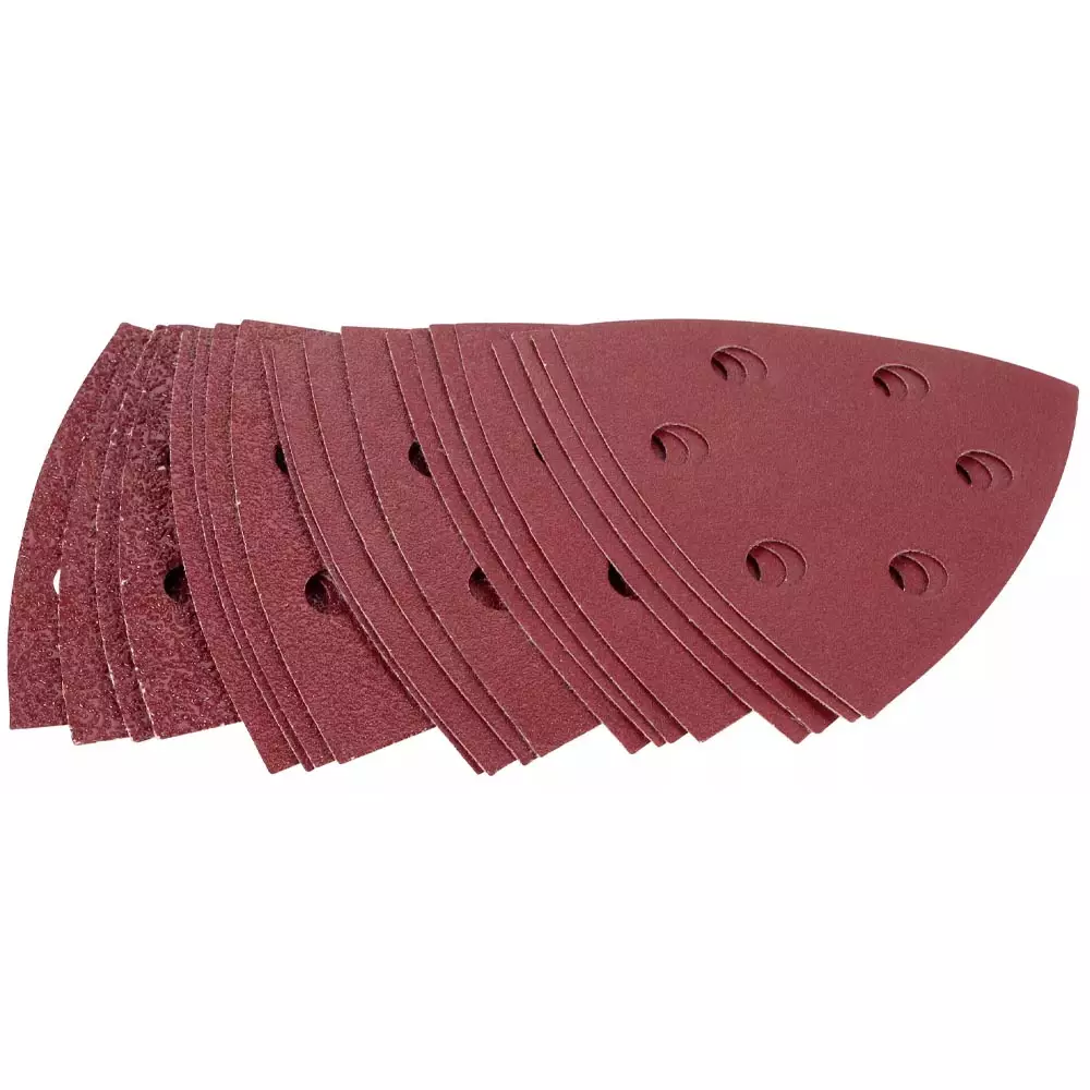 Hiomakolmio 93 mm lajitelma 20 kpl. Tarrakiinnitys, 6 reikää ja karkeudet P40-P180 puun ja metallin hiontaan.