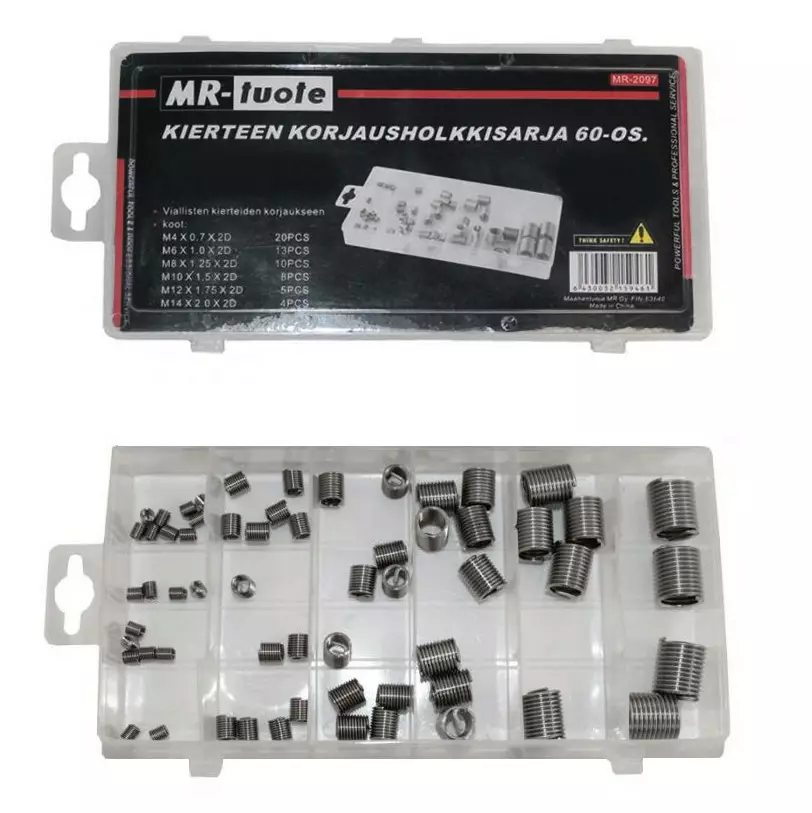 Helppokäyttöinen pulttien kierteen korjausholkkilajitelma sisältää 60 osaa. "Helicoil" -tyyppinen korjaussarja sopii monenlaiseen tilanteeseen.