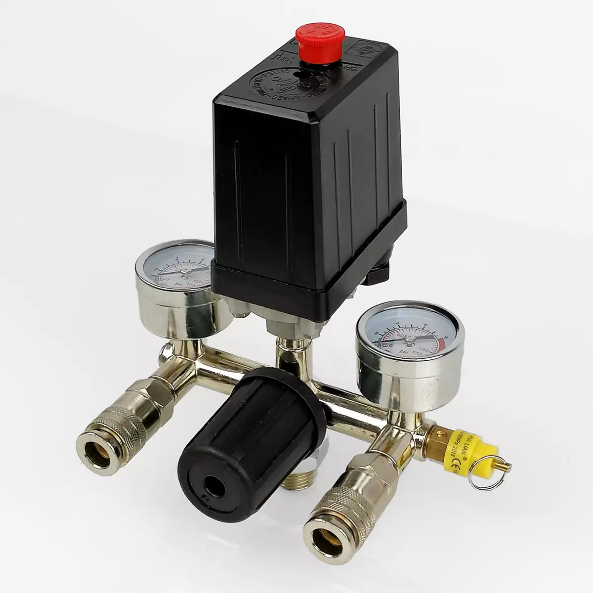 Kompuran paineensäädin mittareilla ja painekytkimellä. Pakkaukseen sisältyy paineensäädin, painekytkin, mittarit ja ylipaineventtiili.