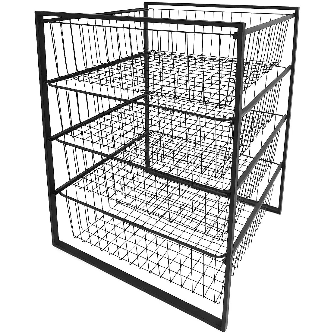 Metallinen korihylly neljällä tilavalla liukukorilla helpottaa arjen säilytyspulmia. Tyylikäs musta väri ja avoin rautalankarakenne tekevät siitä sopivan niin kodinhoitohuoneeseen, vaatekaappiin kuin varastotilaan.