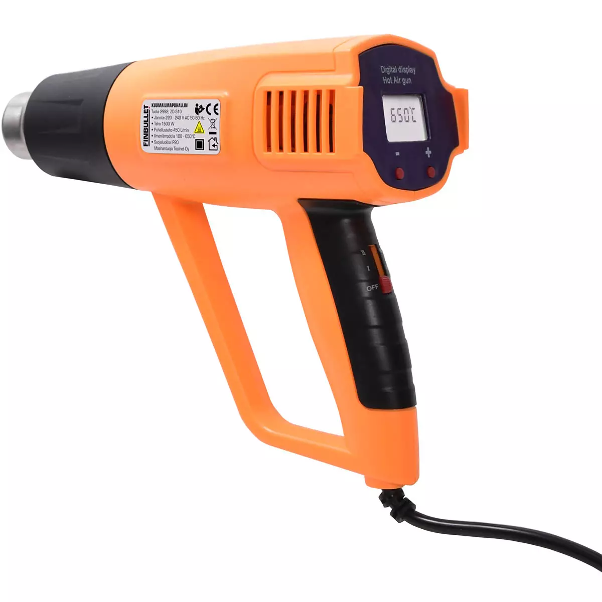 Finbullet 1500 W kuumailmapuhallin on tarkoitettu töihin, joissa lämpötilan hallinta ratkaisee lopputuloksen. Digitaalinen säätö ja LCD-näyttö auttavat asettamaan oikean lämpötilan esimerkiksi maalin irrotukseen, muoviosien muotoiluun tai kutistesukkien käsittelyyn. Laite soveltuu sekä kotikäyttöön että vaativampiin työtehtäviin.