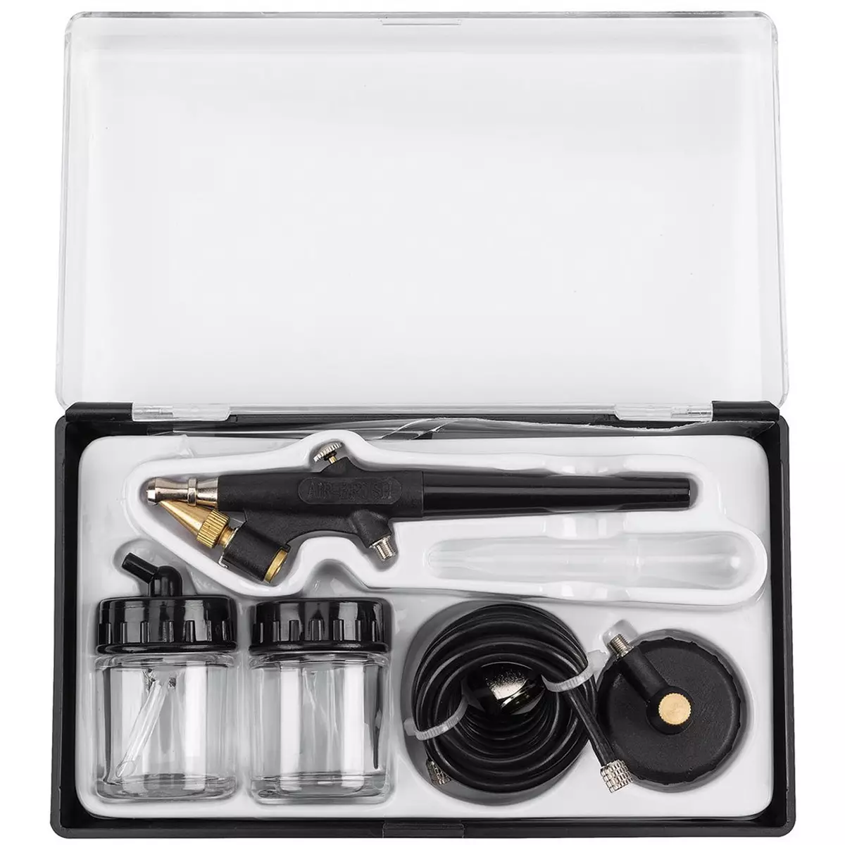 Käytännöllinen kynäruiskusarja lasisäiliöillä on heti valmis käyttöön. Mukana kaksi pulloa eri väreille tai lakoille, pitkä ja joustava ilmaletku sekä standardin mukainen 1/4” liitin helpottamaan liittämistä kompressoriin.