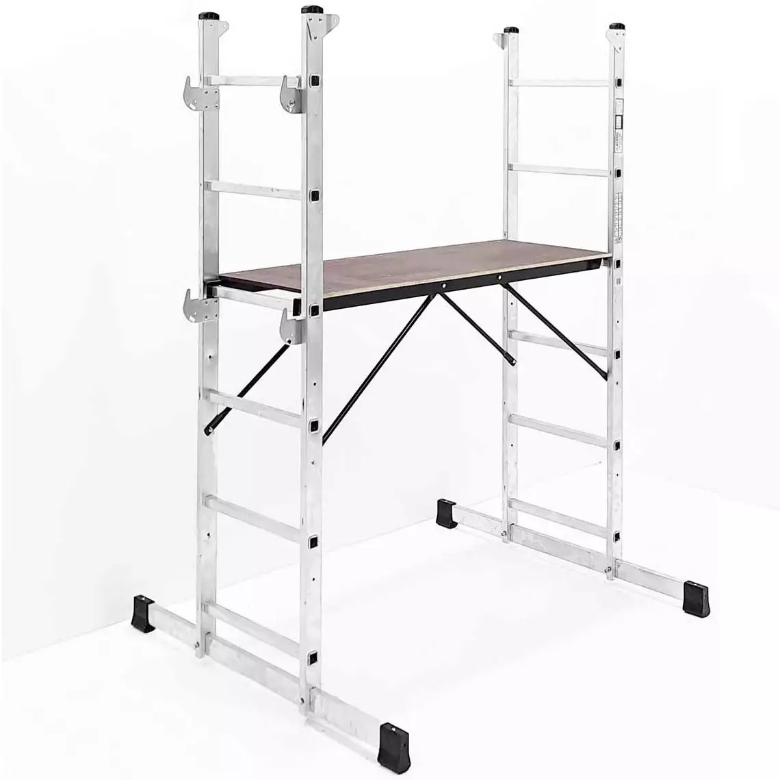 EU:ssa valmistettu rakennusteline on 3 in 1 yhdistelmä, missä on samassa paketissa rakennusteline, A-tikkaat sekä jatkotikkaat. Mukana on 2 osaa, joissa molemmissa on 6 askelmaa ja korkeudeltaan tikasosat ovat 1,61 m. Rakennustelineen pituus on n. 1,2 m ja työskentelykorkeudeksi on mahdollista saada n. 1 metri. Rakennusteline on kätevä myös portaikossa. Tason koko on n. 110 cm x 45, joten työskentelytilaa on mukavasti ja myös remonttivälineille ja maalipurkeille jää tilaa.