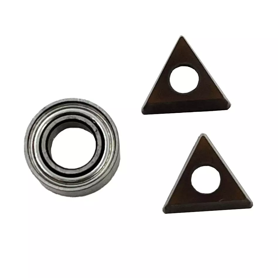 Laadukas ja kestävä viistekoneen vaihtoteräsarja sopii erilaisten metallilevyjen, -pintojen ja -kappaleiden työstämiseen. Pakkaaus sisältää kaksi kolmionmuotoista teräpalaa sekä yhden terän kuulalaakerin. Kolmion muotoisen teräpalan sivujen pituus on 8 mm ja keskireiän halkaisija 1,5 mm. Terän kuulalaakerin ulkohalkaisija on 8 mm ja sisähalkaisija 3 mm.