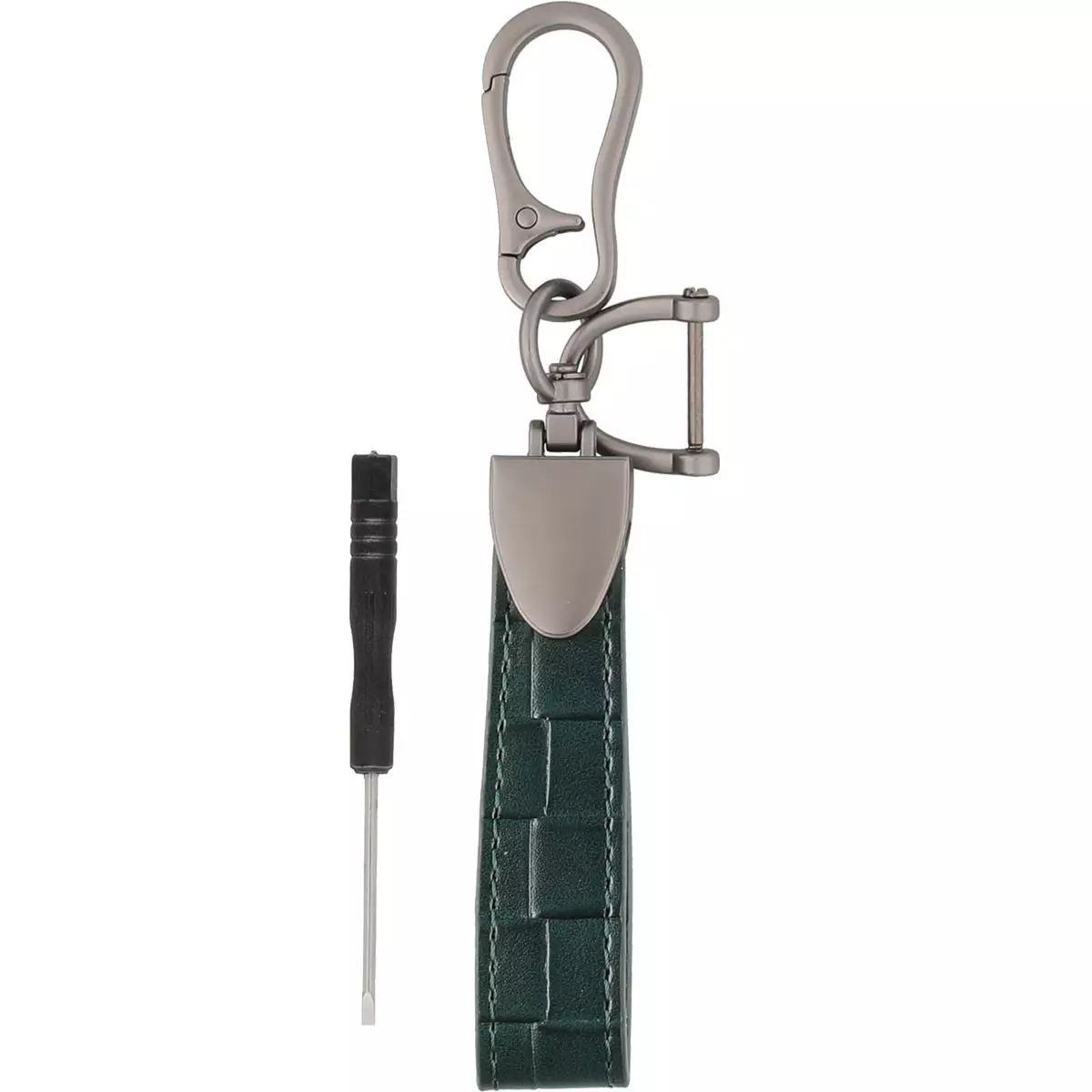 Acces-avainpidike yhdistää modernin designin ja käytännöllisyyden. Vihreä PU-nahkahihna, gun-metallinen karbiinikoukku ja mukana tuleva pieni ruuvimeisseli tekevät tästä avaimenperästä täydellisen valinnan niin arkeen kuin matkalle.