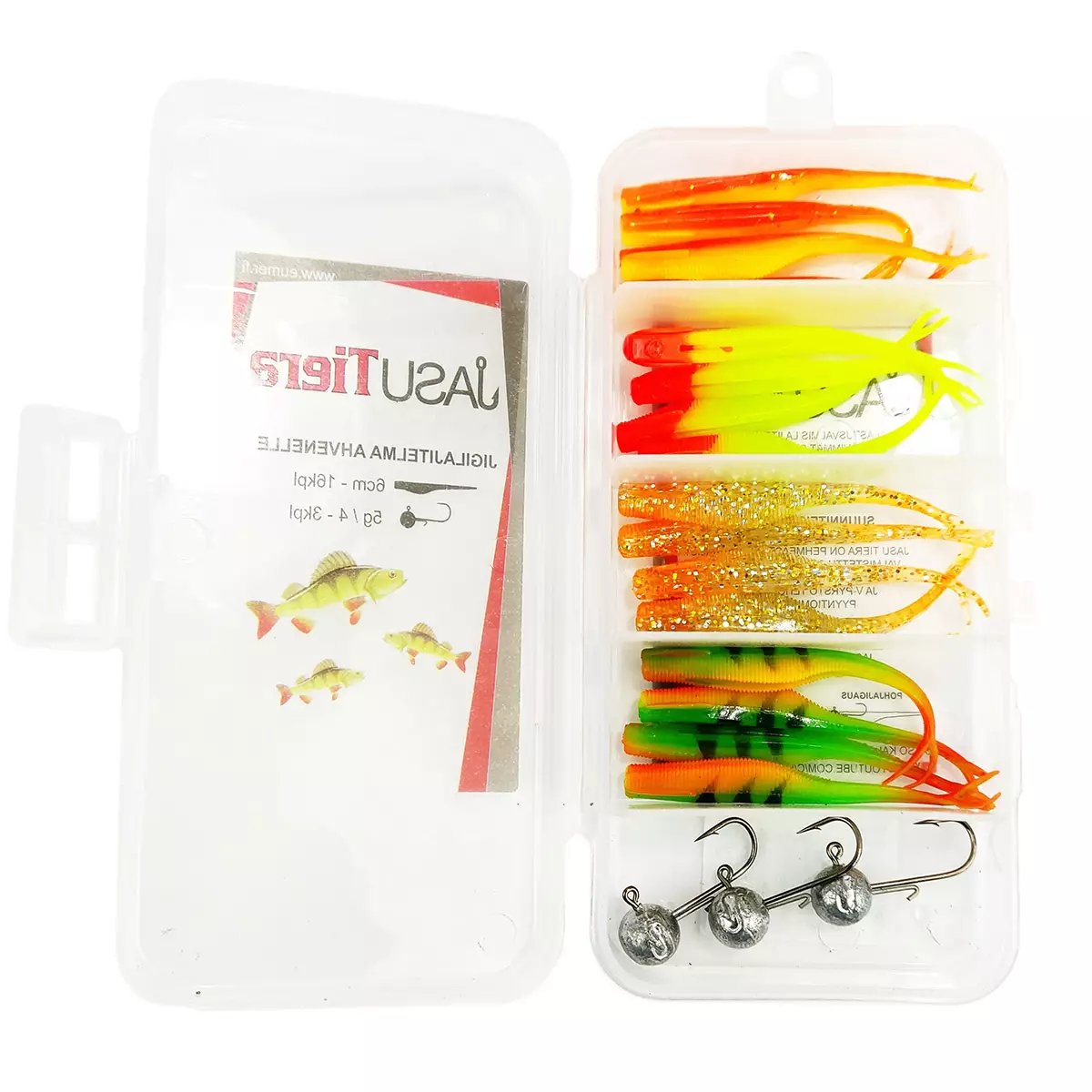 Jigilajitelma ahvenelle merkiltä Jasu. Sisältää 6 cm Tiera kalajigejä 16 kpl sekä 3 kpl jigipäitä. Toimiva setti jigaukseen.