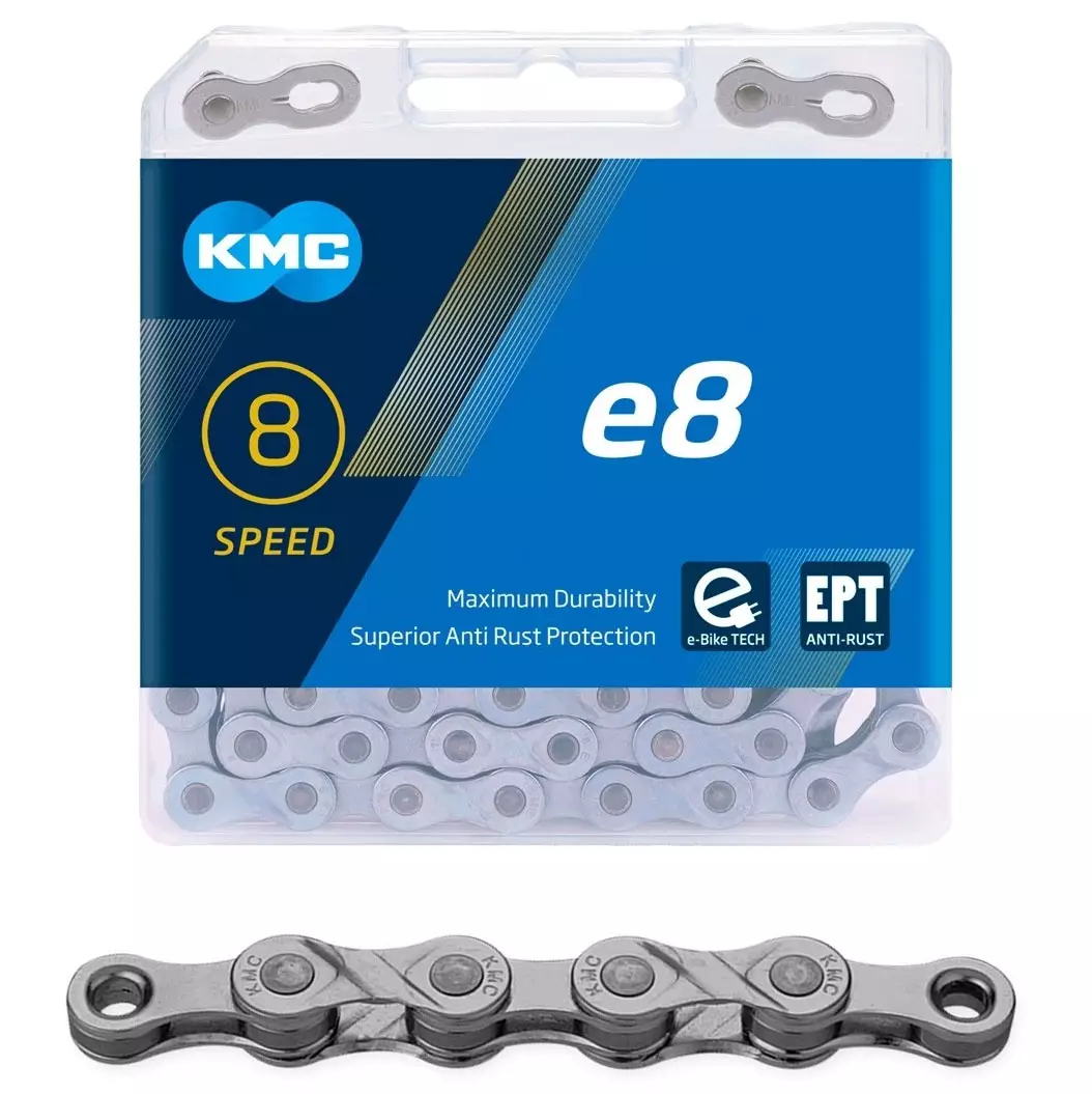 Laadukas ja kestävä KMC-ketju on suorituskykyinen valinta 8-vaihteisiin pyöriin. Ketju on yhteensopiva 8-rattaiseen takapakkaan ja ketju voidaan asentaa keskimoottorilla varustettuihin sähköpyöriin, joissa on 8 vaihdetta. Pitkäikäinen ketju on pituudeltaan 122 lenkkiä ja ketju on nopea vahtaa paikoilleen Triple X-bridge muotoilun ansiosta. Nikkelipinnoitettu ja ruostesuojattu ketju on Shimano, Campagnolo ja Sram yhteensopiva.