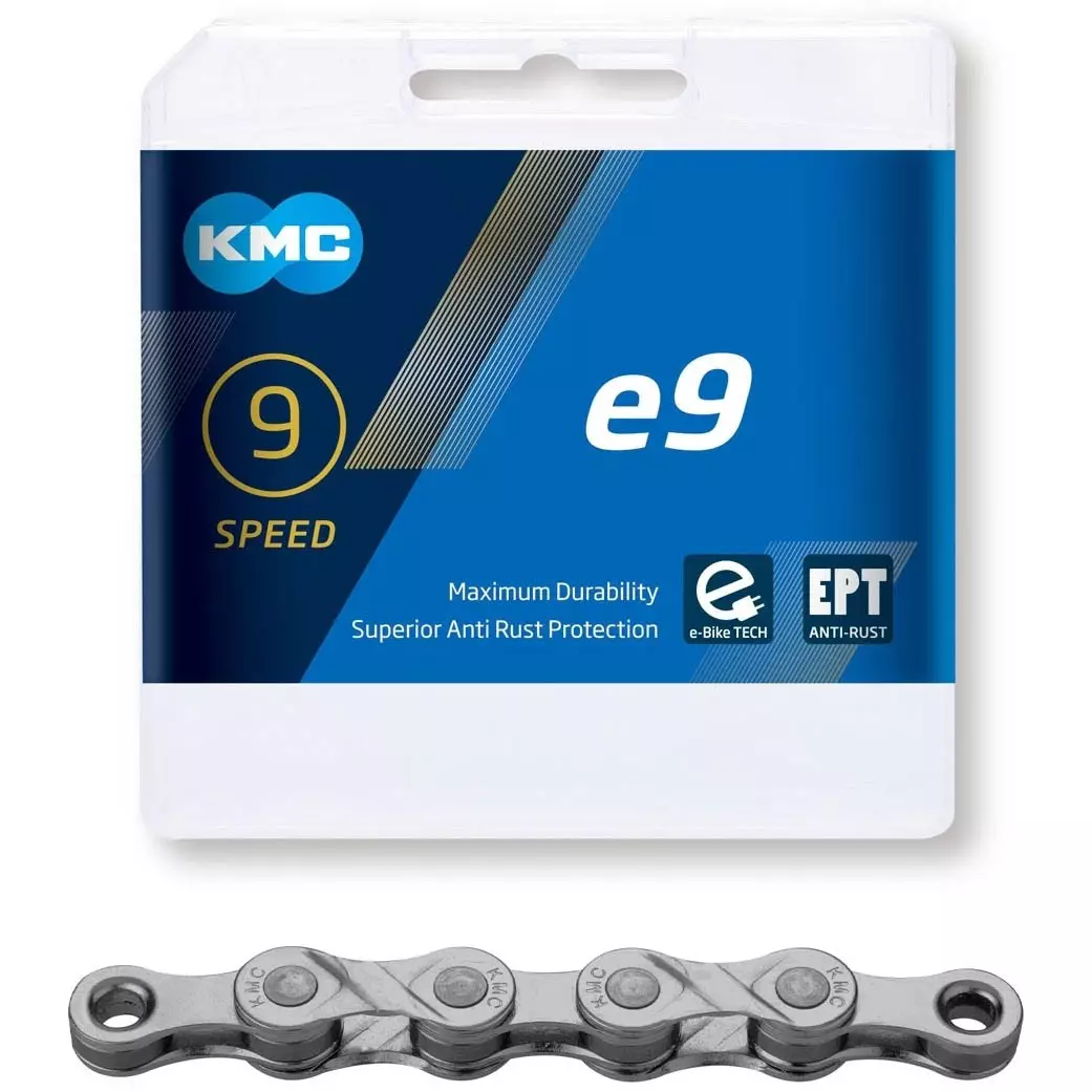 Korkealaatuinen KMC-ketju sähköpyörään. KMC e9WPT -ketju sopii 9-vaihteisiin pyöriin. Polkupyörän ketjussa on 136 lenkkiä ja tapin pituus on 6,6 mm. Nikkelipinnoitettu ketju on ruostesuojattu parhaan laadun ja kestävyyden takaamiseksi. Tämä ketju sopii keskimoottorilla varustettuihin 9-vaihteisiin sähköpyöriin.
