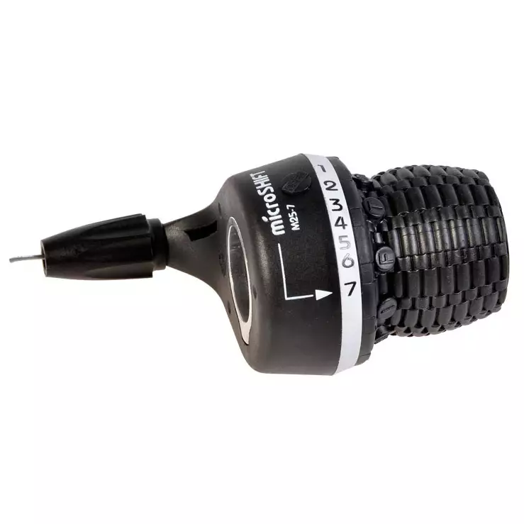 Laadukas Microshift kiertovaihdekahva 7-vaihteiseen vaihteistoon. Shimano- yhteensopiva vaihdevipu sisältää vaijerin.