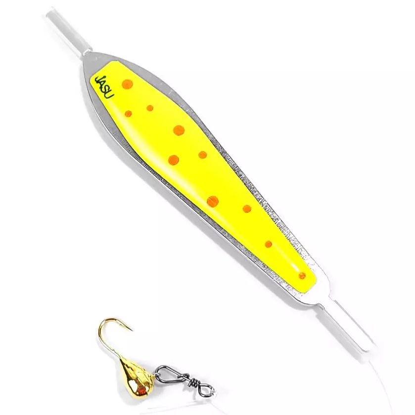 Keltaoranssilla värityksellä viimeistelty liukupilkki ahvenen, jalokalan ja kuhan tehokkaaseen pilkintään. Liukupilkin mukana toimitetaan tapsisiima ja kultainen morri.