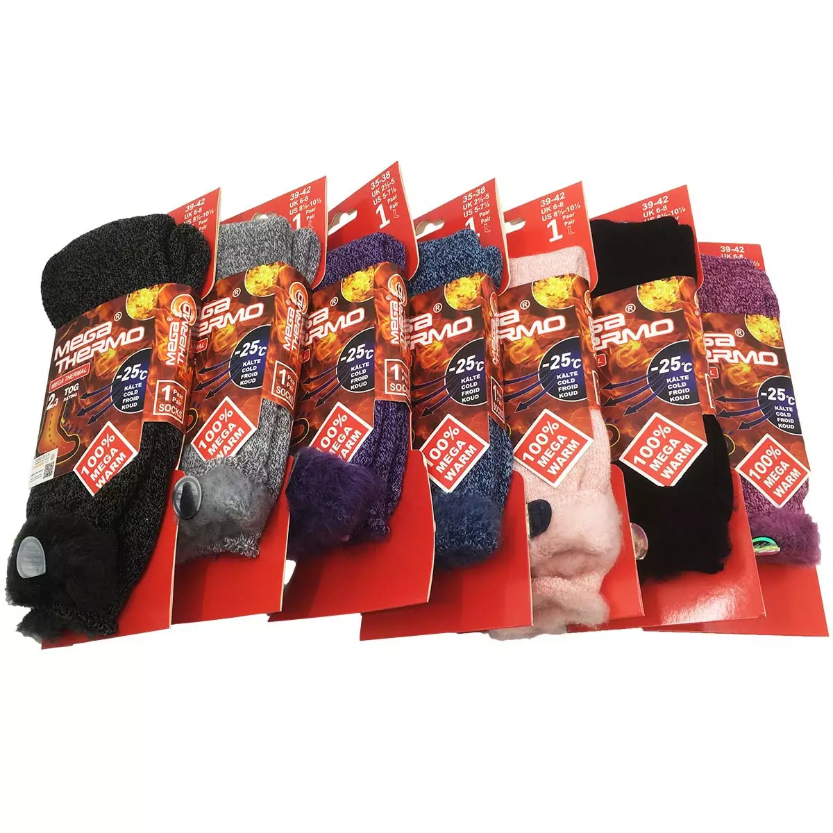 Naisten megathermo lämpösukat on suunniteltu erityisesti talvea varten. Lämpösukat on sisältä harjattua pehmeää ja miellyttävää materiaalia ja päällysosa on tiivistä neulottua ja joustavaa materiaalia. Naisten megathermo sukat ovat yhdistelmäkokoa 39-42 ja lisäksi sukkia on saatavana 7 eri värissä. Naisten lämpösukat on materiaaliltaan 97% akryyliä ja 3% elastaania. Ihanan pehmeät ja lämpimät sukat sopivat jopa -25°C pakkasille pitäen jalat lämpiminä.