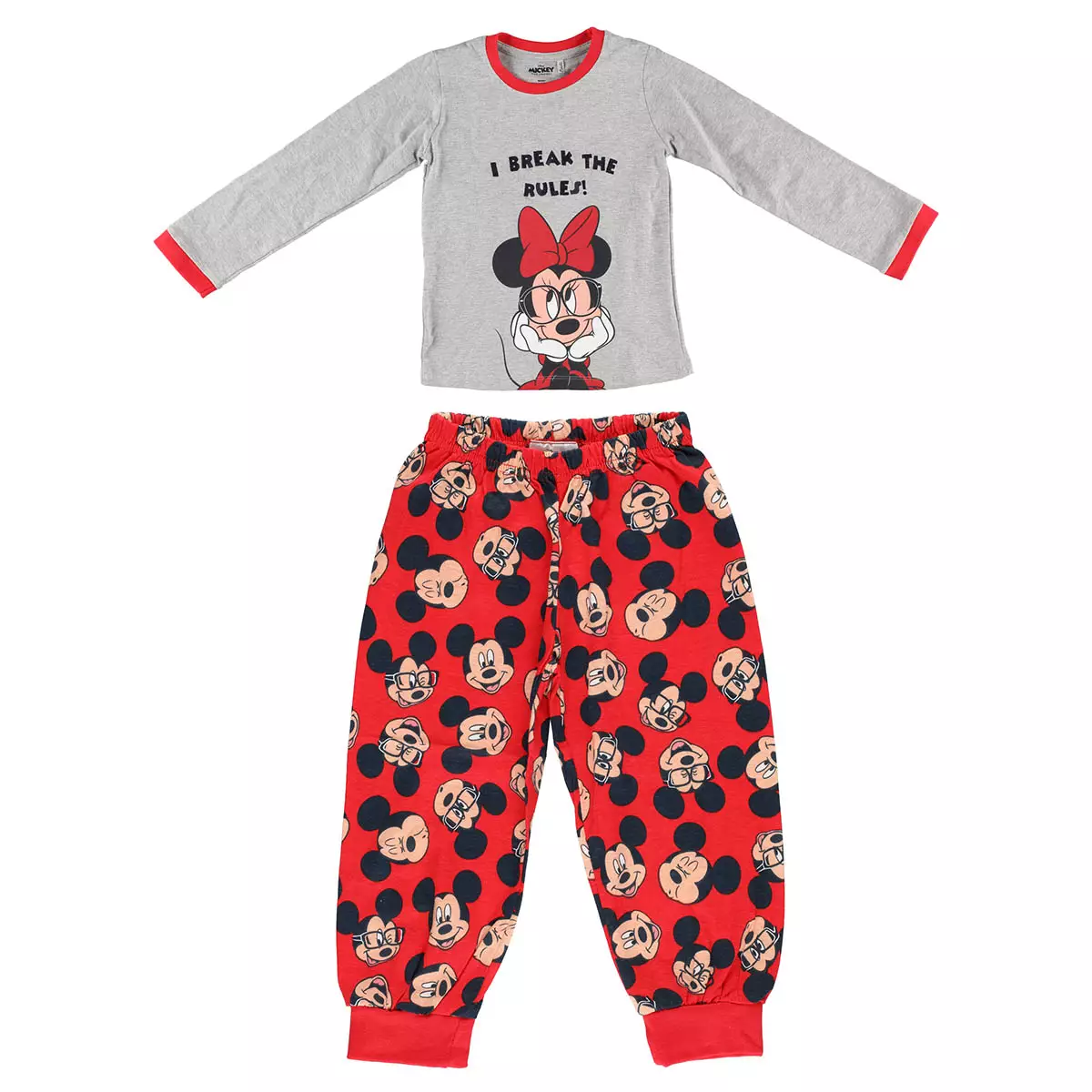Ihana Minni ja Mikki Hiiri aiheinen lasten yöpuku. Pehmeä puuvillasta valmistettu lasten Disney pyjamasetti sisältää pitkähihaisen yöpaidan ja pitkätlahkeiset yöhousut. Harmaa yöpaita on koristeltu ihastuttavalla Minni Hiirellä ja punaisissa pyjamahousuissa seikkailee suloinen Mikki Hiiri. Mukavan tuntuinen lasten puuvilla pyjama 4-vuotiaiden koossa.