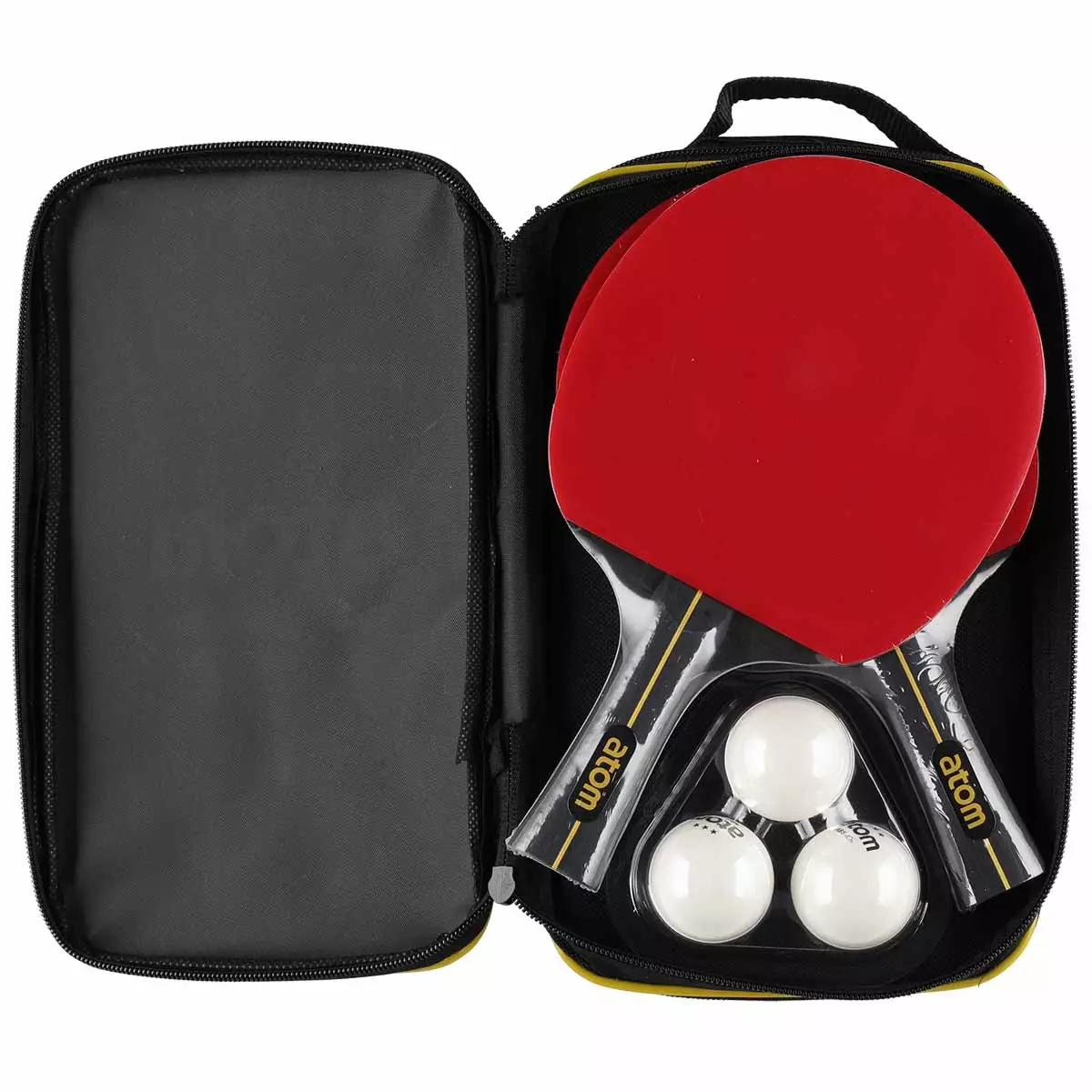 Kompakti ja laadukas Atom Pingissetti Play Anywhere tarjoaa täydellisen ratkaisun pöytätenniksen ystäville. Käytännöllinen vetoketjullinen laukku sisältää kaiken tarvittavan: 2 mailaa, 6 palloa sekä helposti pöytään kiinnitettävän verkon.