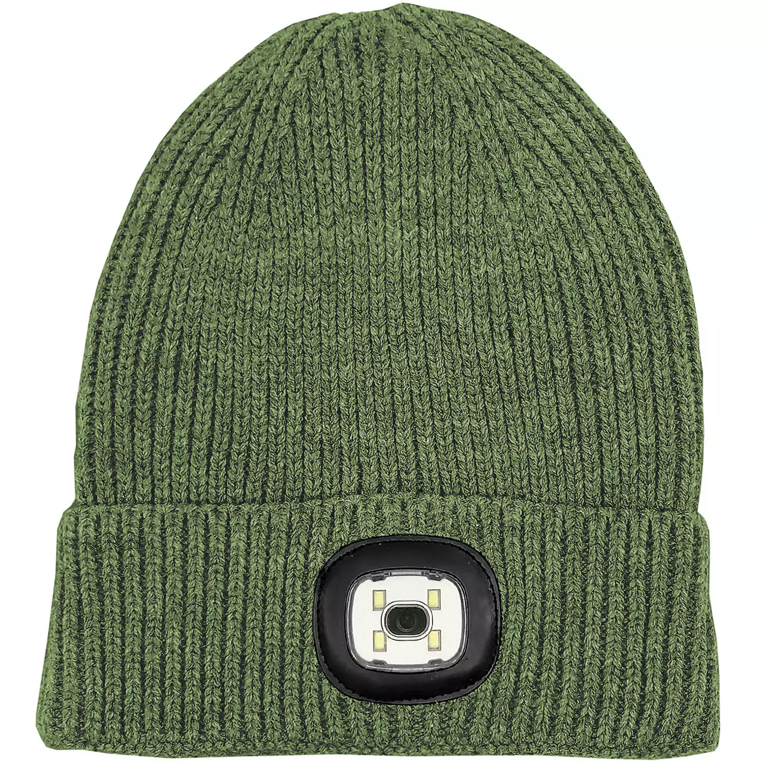 Vihreä neulepipo integroidulla otsavalolla. Led-lamppu on helppo ladata USB-pistokkeella. Kätevä neulepipo harrastuksiin, ulkoiluun ja työntekoon.