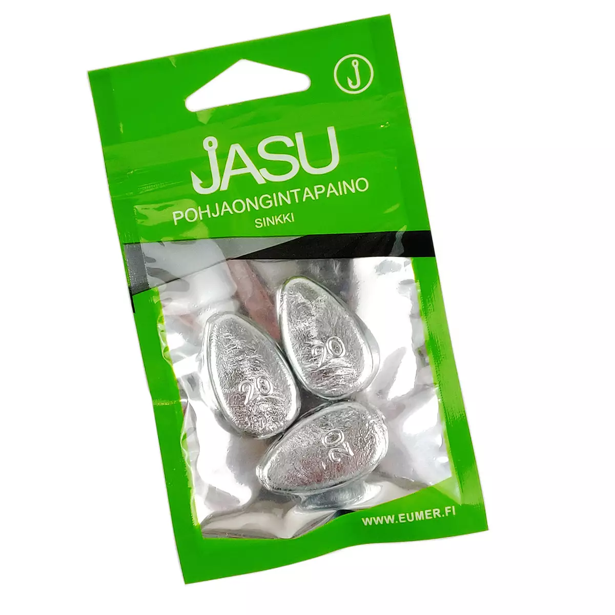 Pohjaongintapaino merkiltä Jasu on valmistettu sinkistä, joten se on täysin lyijytön. Pohjaongintaan tarkoitettu paino on liukuva, joten kala ei tunne painoa napatessaan syöttiin. Pääsiima kulkee painon sisällä ja se lukitaan paikalleen leikarin avulla. Leikarin toiseen päähän kiinnitetään puolestaan pohjaonkiperuke ja koukku. Tämä pohjapaino painaa 20g, joten se soveltuu seisovaan veteen. Pakkauksessa on kolme pohjapainoa.