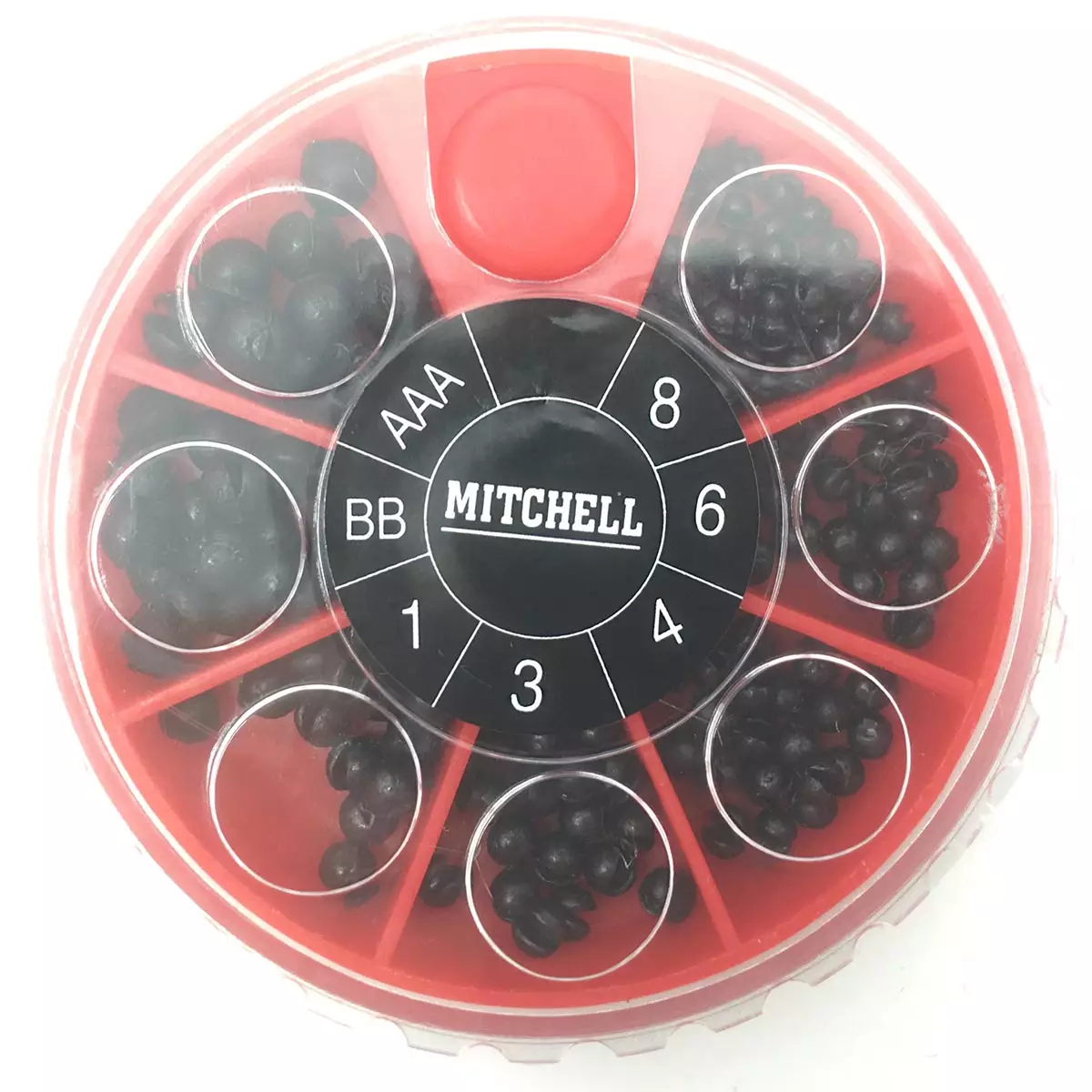 Lyijyttömät siimapainot Mitchell -merkiltä kätevässä muovisessa säilytysrasiassa. Painolajitelmaan kuuluu seitsemän eri kokoa: 8, 6, 4, 3, 1, BB ja AAA. Näppärät Split Shot Sinkers -siimapainot mukaan kalastukseen.