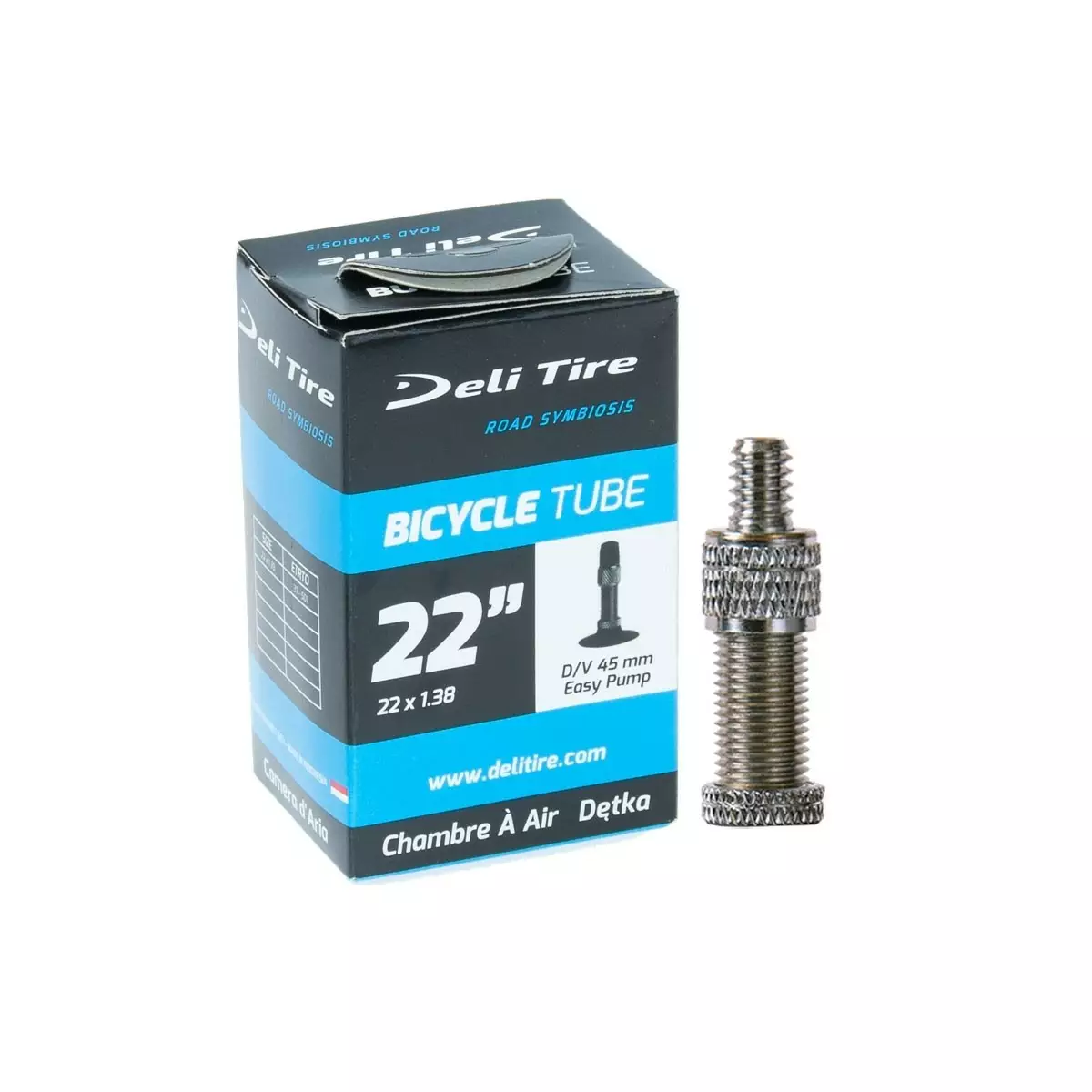 45mm D/V pikaventtiilillä varustettu laadukas Delin sisäkumi lasten 22" polkupyörän renkaaseen. Sisärengas täyttää ETRTO mitoitukset, ja rengas on testattu 24h kestävällä ilmapainetestillä. Näin valmistaja takaa 100% täydellisen suorituskyvyn ja renkaan laadun!