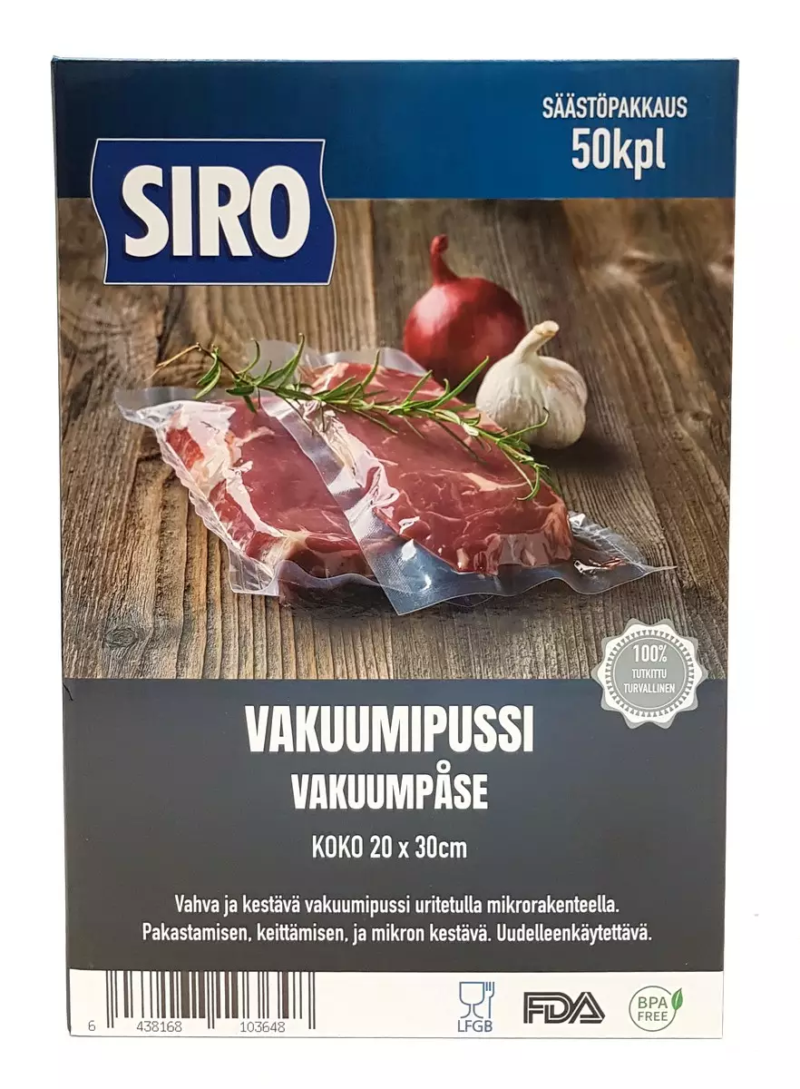 VAKUUMIRULLA 20x500cm 2kpl SIRO Erittäin kestävät vakuumirullat lihan, kalan, marjojen ja muiden vastaavien tyhjiöpakkaamiseen ja säilyttämiseen. Siro vakuumirullat ovat 100% tutkitusti...