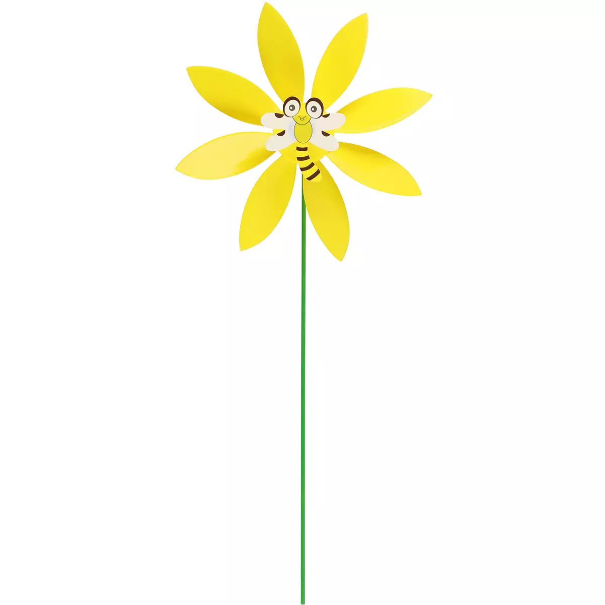 Kirkkaankeltainen kukka ja iloinen mehiläinen yhdistyvät hauskalla tavalla näyttäväksi puutarhan koristeviipperäksi. Kun tuuli tarttuu keveisiin lapoihin, syntyy pyörivä liike, joka houkuttelee katseita ja pitää samalla huolta siitä, että tietyt eläimet pysyvät loitolla viljelyksistä.