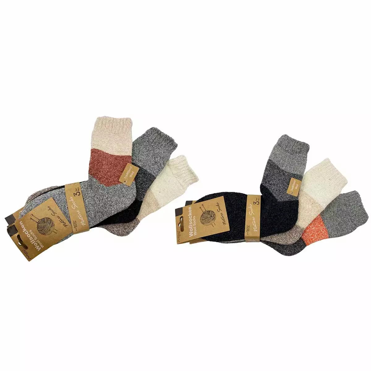 Sukkapakkaus sisältää kolme paria lämpimiä, korkealaatuisia villasukkia. Sukat on valmistettu 35-38 kokoisille jaloille. Kolmen sukkaparin paketista on kahta eri värivaihtoehtoa: sukat joissa punainen, harmaa tai beige raita varressa ja sukat joissa harmaa, beige tai oranssi raita varressa.